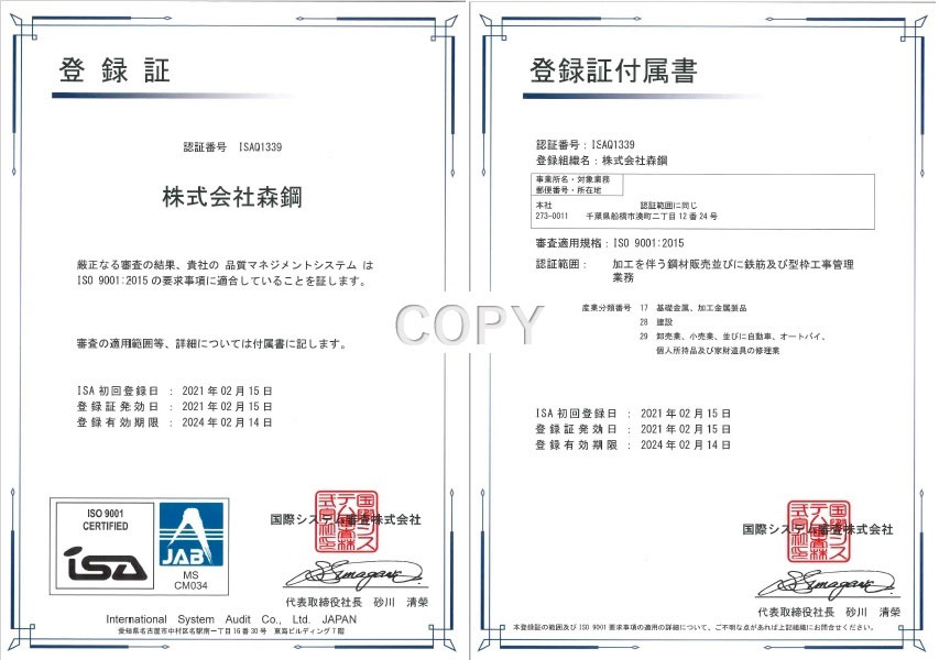 ISO9001を取得致しました 2021.03.01 リリース 弊社は2021年2月15日に「ISO9001:2015(品質マネジメントシステム)」認証を取得しました。 これからも、お客さまの満足向上と品質の維持・改善管理に努めてまいります。 今後とも宜しくお願いいたします。 最新の記事 2021.08.23 勤続5年・10年賞表彰 2021.08.21 門型クレーン設置 2021.08.19 自主検査風景 カテゴリー リリース (2) 森鋼ブログ (3) 現場ピックアップ (3)